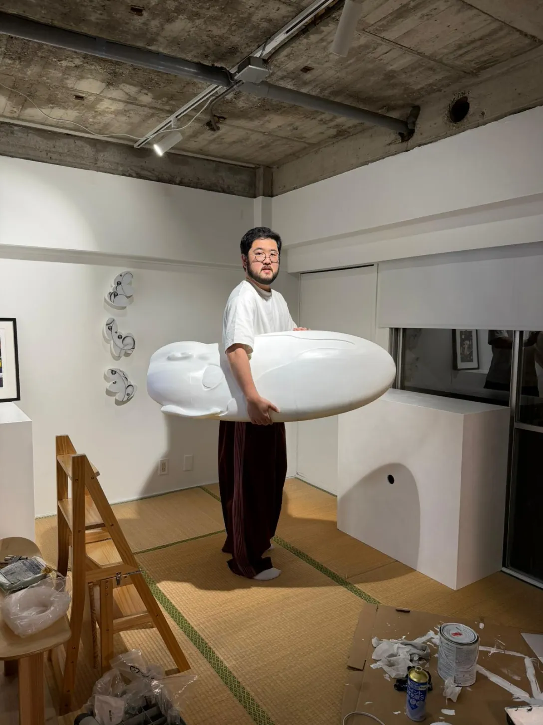 For the preparation of Nanikore Exhibition, 9 of us arrived in Fukuoka few days before the opening for the set up. We had our meeting on the floor before transforming the space into our exhibition. Our luggages were pretty much full with artworks, monitors, equipments, as well as our hopes and dreams 😆 It was our first time in Fukuoka. This time we rented Roro Art Space from our friend Ferdi. From the previous 2024 exhibition at Chignitta gallery in Osaka, we have 3 of ArtGumi's 42-inch monitors stored here for future use within Japan. Since Ferdi has his art space, we are happy that he could use them while we are not on exhibit. Roro Art Space is on the 5th floor of the 60 years old building which is gradually transformed from apartment into art hub. Having the tatami floor gives a warm and friendly feeling. Since ArtGumi is built around friendship, the space concept suits this exhibition very well. There is no elevator here. So we have been carrying our stuff up to the 5th floor and get super muscular at the end of the show 💪✨ Also a very good reason to eat all the good food around the area ✨